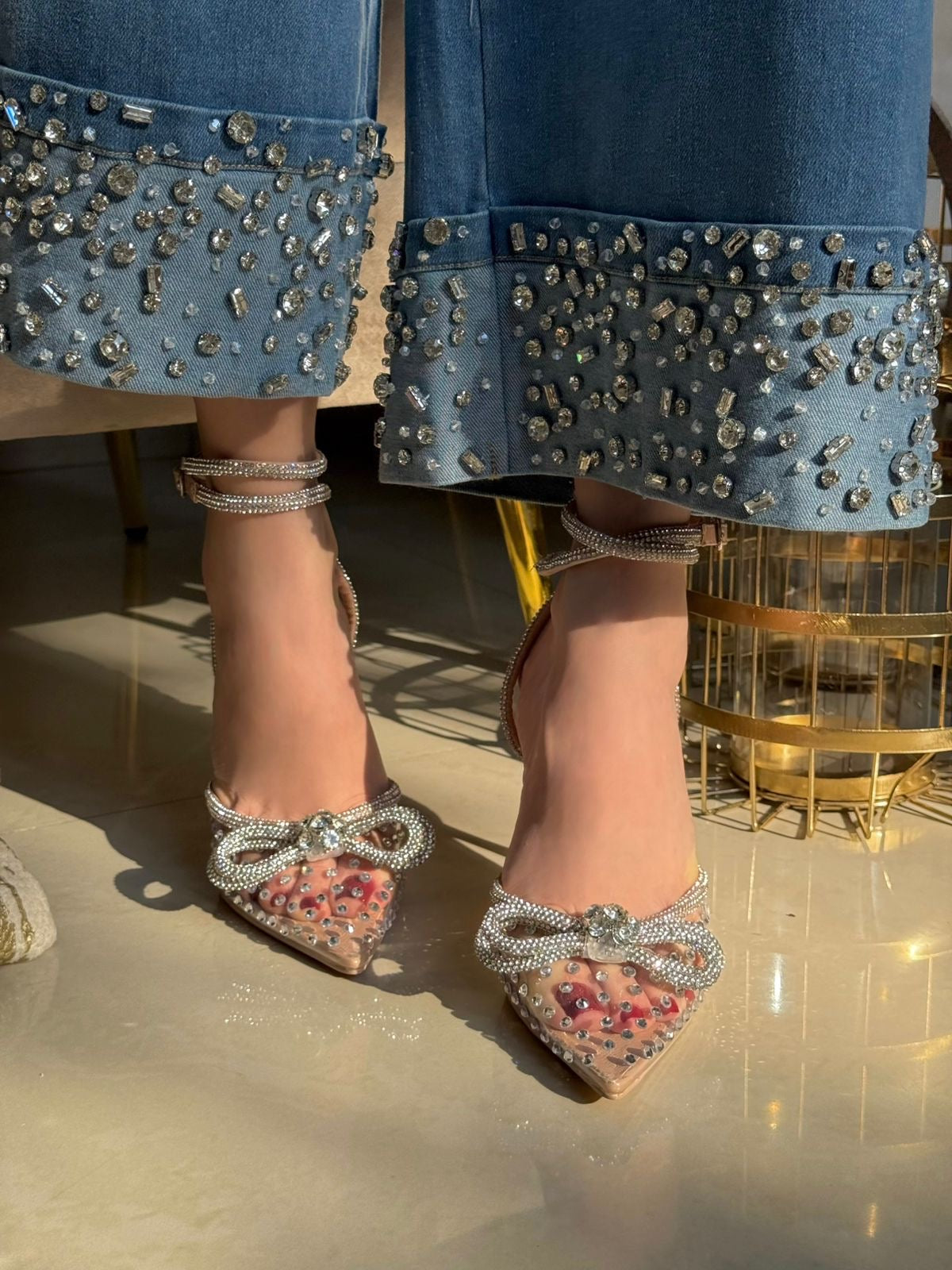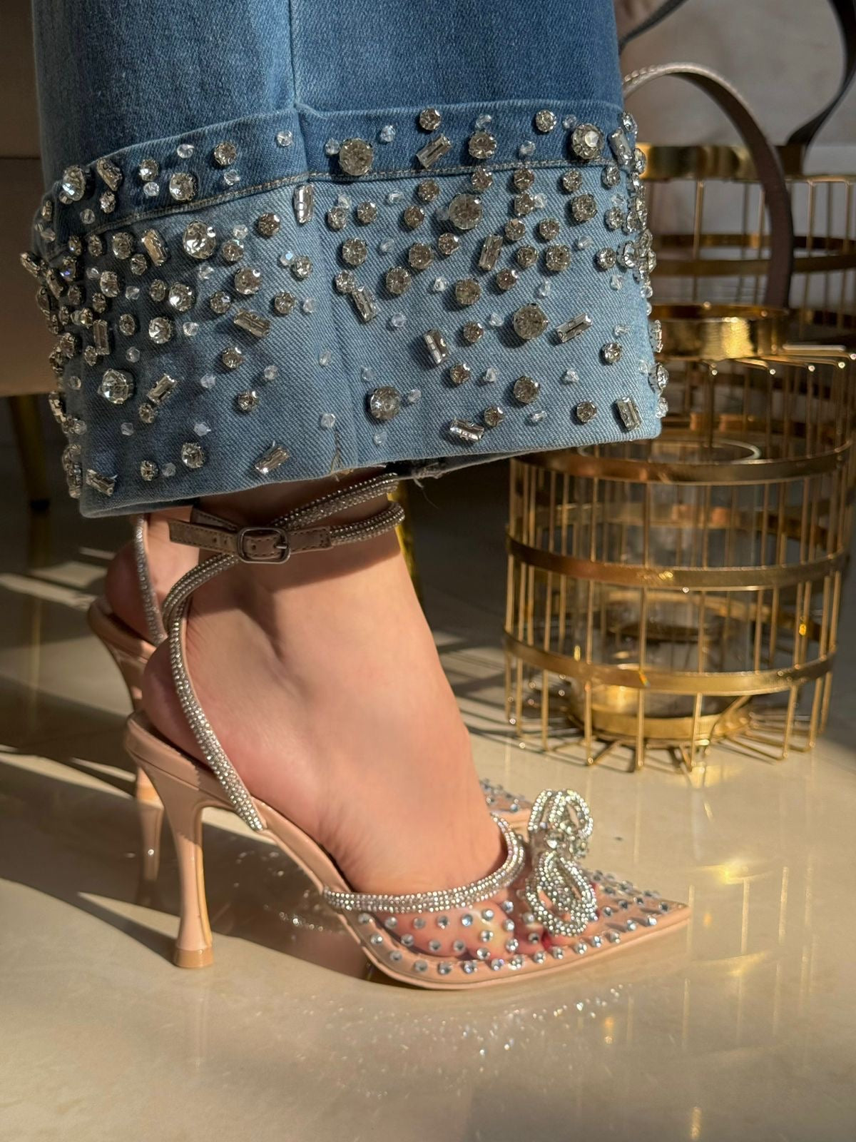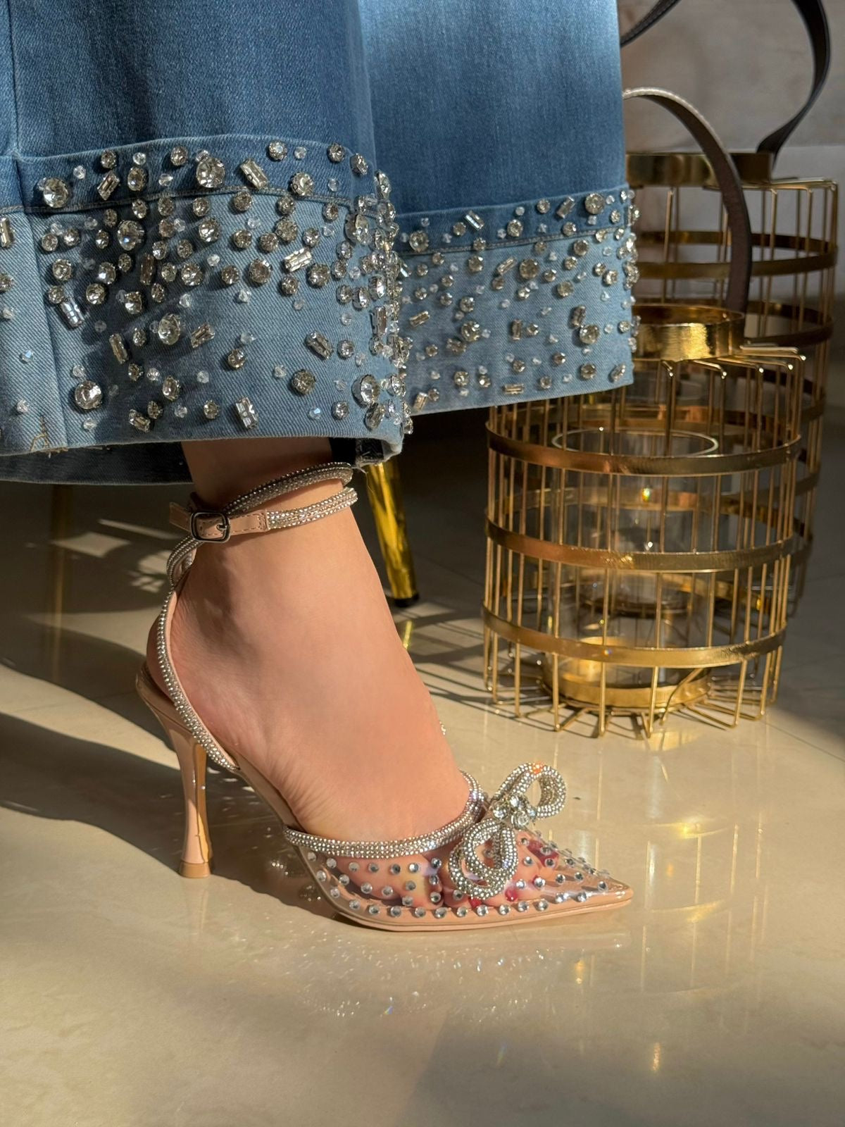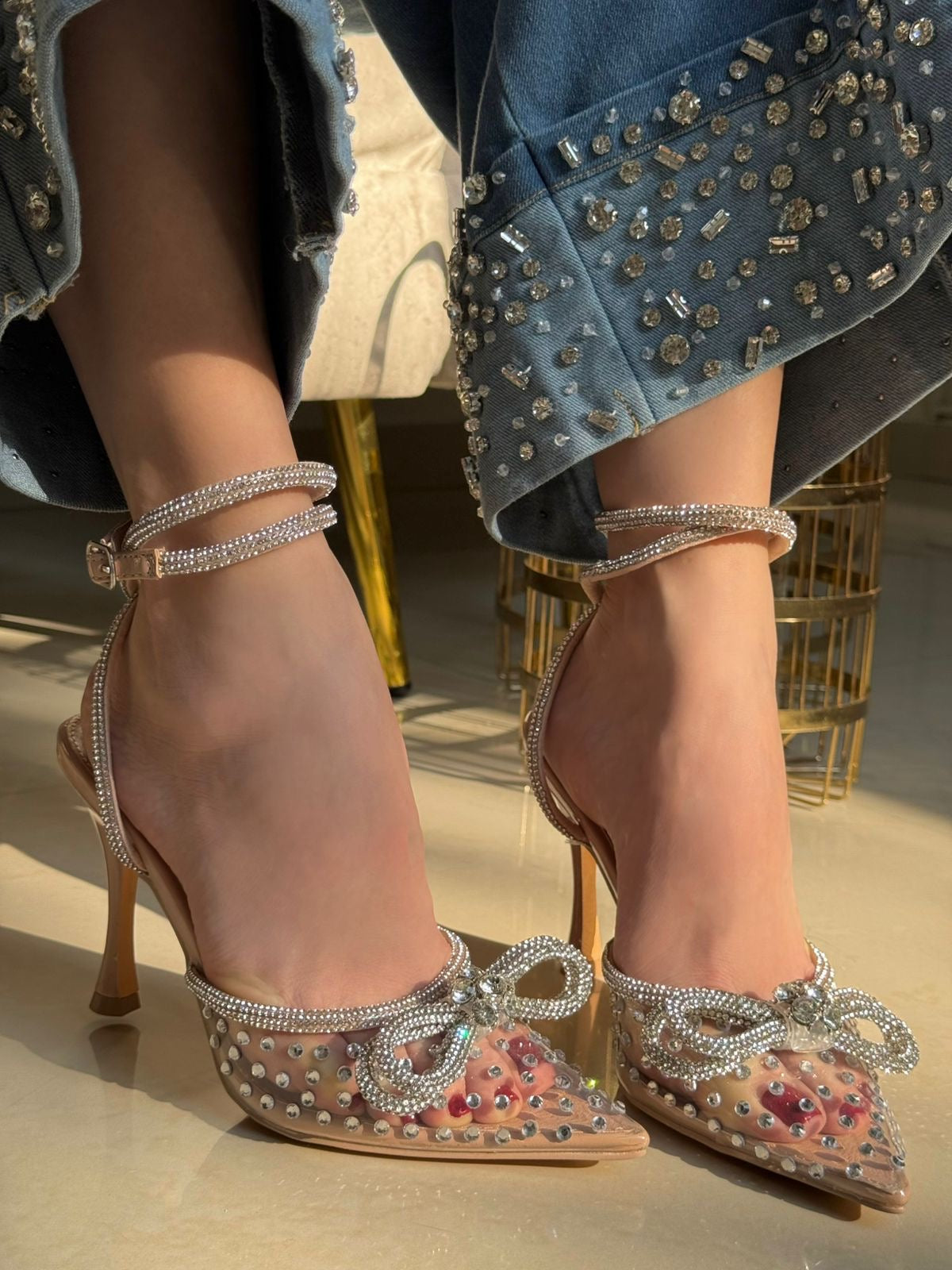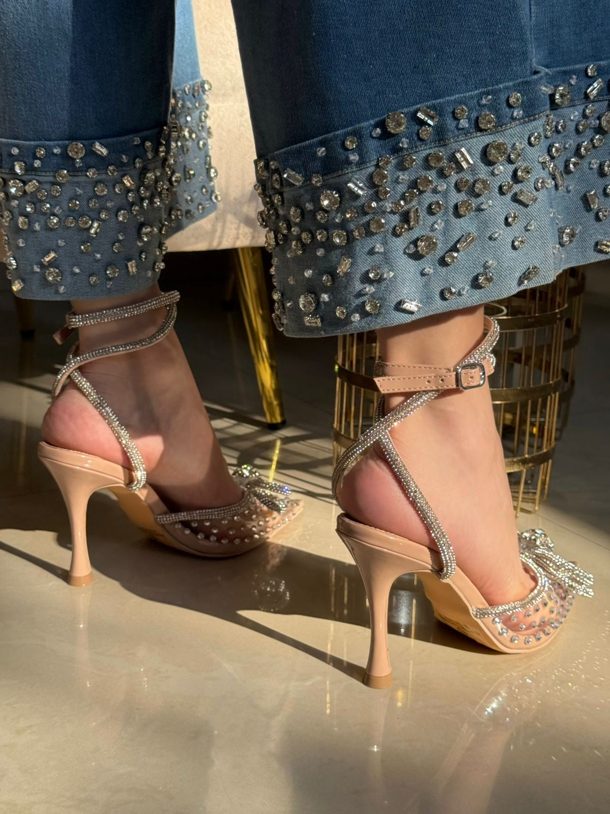 STILETTO BEIGE CON TRANSPARENCIA DETALLE EN PEDR4AS Y MOÑO